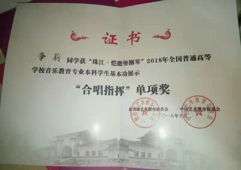 10月22日至10月26日, 2018年全国普通高等学校音乐教育专业本科学生基本功展示在广西师范大学隆重举行,我院音乐学专业2015级李莉、宫悦等学生沉着应战,分别获得“合唱指挥”和“中外乐器演奏”的单项奖,实现了该项赛事获奖零的突破,充分展示了我院音乐专业学生的综合素质与专业能力。