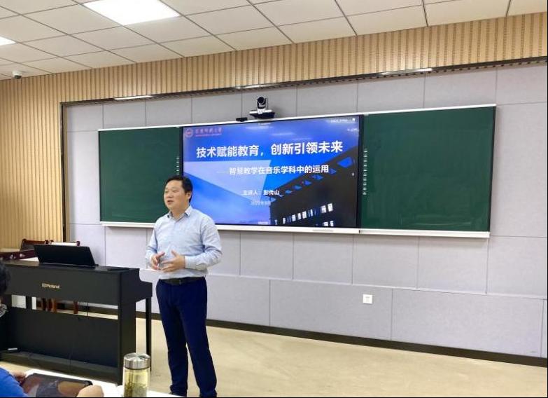 为进一步加快推进信息技术与教育教学融合创新,助力教师熟练应用智慧教学手段和方法,提高教学能力和教学效果,推进“互联网+教学”改革进程,9月28日下午,伟德国际victor1946在智慧教室举办“智慧教学在音乐学科中的运用”的教学专题讲座,由伟德国际victor1946副院长彭传山主讲、副院长徐冉主持,教务处副处长阮建玲参与指导,学院全体教职工及部分研究生到场聆听。