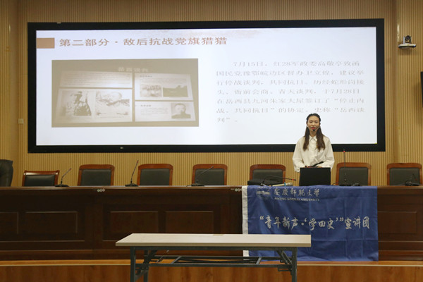 5月12日,我院开展党史学习教育专题宣讲活动,校“青年新声˙学‘四史’”宣讲团为我院入党积极分子培训班学员做《烽火岁月,不屈战歌》主题宣讲报告,中国近现代史基本问题研究专业2019级研究生王利华与马克思主义中国化专业2020级研究生黄薛杰担任主讲人。