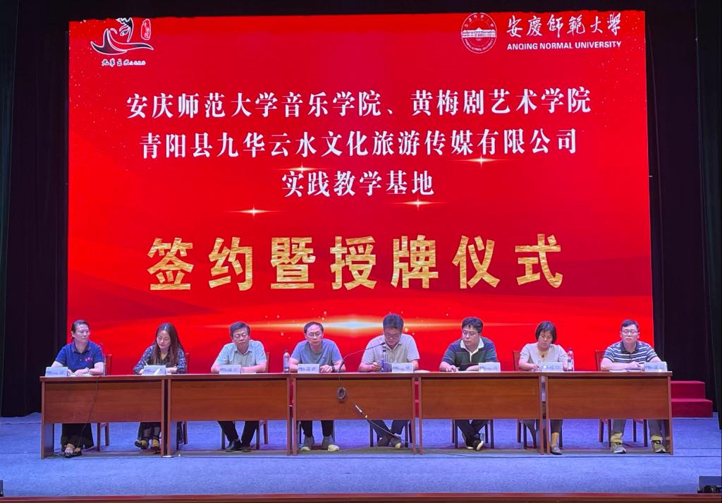 8月18日下午, 我院、黄梅剧艺术学院与青阳县九华云水文化旅游传媒有限公司在青阳腔博物馆小剧场隆重举行了实践教学基地签约暨授牌仪式。我院党委书记张铭、黄梅剧艺术学院党总支书记汪博武、我院副院长徐冉、副院长高艳,青阳县文旅局党组副书记罗桂珍、副局长杨荫武参加了此次签约暨授牌仪式。