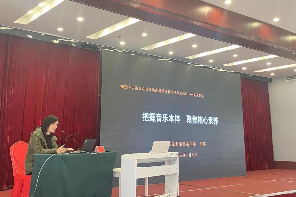 2023年2月7日,安徽工业大学附属中学马超老师分别为2022年安徽省“国培计划”农村紧缺薄弱学科教师短期集中培训项目——艺术(音乐)小学音乐班和中学音乐班开展系列讲座第三场《深入音乐本体、聚焦核心素养》。