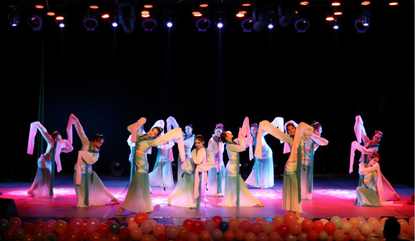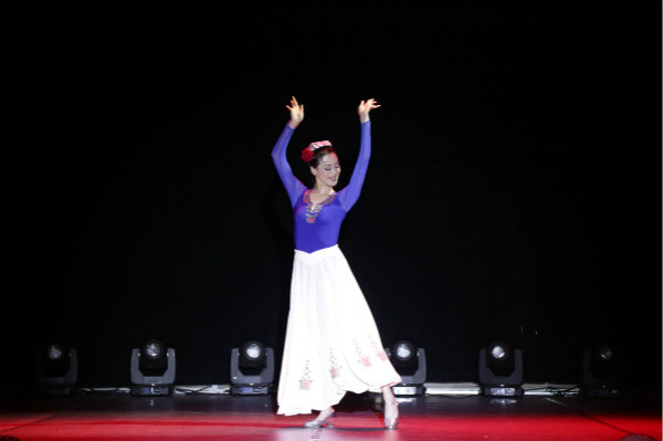 对于舞蹈表演专业来说,民族舞是最能体现舞蹈功底的舞种。张子桐、于梦雅等表演的《傣家的女儿傣家的雨》、伍月、许梦楠表演的哈萨克舞《鲜花》、王思雨表演的瓦族舞蹈《佤哈》以及舞蹈表演专业老师袁帆表演的维吾尔族舞蹈,将演出推向高潮。袁帆身着维吾尔族长裙,只见她在台上优雅地舞蹈,手指优美地变换,给台下观众们带来了不一样的异域风情。