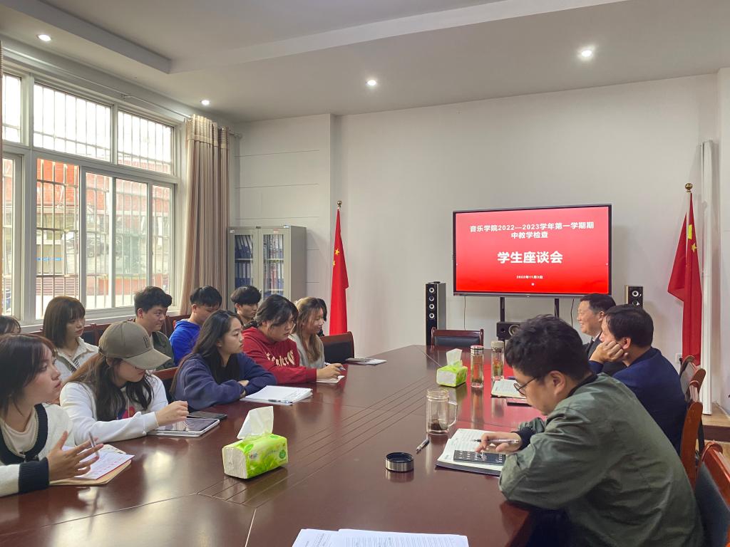 2022年11月3日下午,伟德国际victor19462022-2023学年第一学期期中教学检查学生座谈会在艺术楼一楼会议室召开。学院党委副书记肖之进、副院长徐冉、副院长彭传山、教师代表王光丽以及20级、21级、22级学生代表参加座谈会,会议由副院长彭传山主持。