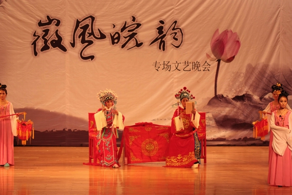 晚会由我校与安徽财经大学联合举办,我院艺术团对此次演出高度重视,从演员安排和节目筛选都做了充足的准备与精心的安排,选送了富有代表性的黄梅戏经典选段如:《天仙配·鹊桥》、《戏牡丹》、《女驸马·洞房》等,还特别安排了在传统黄梅戏基础上改编而成的黄梅剧目《公堂提审》。整场晚会由凸显安徽地方特色的黄梅戏贯穿全场,让观众深切感受到一股“徽风皖韵”的山野之风。