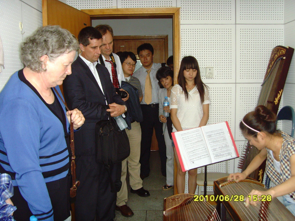 在伟德国际victor1946院长、黄梅剧艺术学院院长荀安华、副院长刘蕊的引导下,客人一行还参观了艺术楼教室、琴房,饶有兴趣地观摩了马强伟老师的竹笛教学公开课,参观了数码钢琴教室,欣赏了学生的古筝表演,灵活多样的课堂教学形式,学生富有激情的弹奏表演,给美国客人留下了深刻的印象。