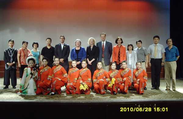 美国客人一行先参观了音乐厅,并观看了黄梅戏表演专业学生的表演。学生们表演了《送香茶》、《昭君出塞》等黄梅戏节目,精彩的表演让远洋而来的客人们领略了黄梅戏这朵中华艺术奇葩的魅力。客人们不时伸出大拇指来称赞,对学生们的娴熟翻腾、虎跳等动作,报以阵阵掌声。