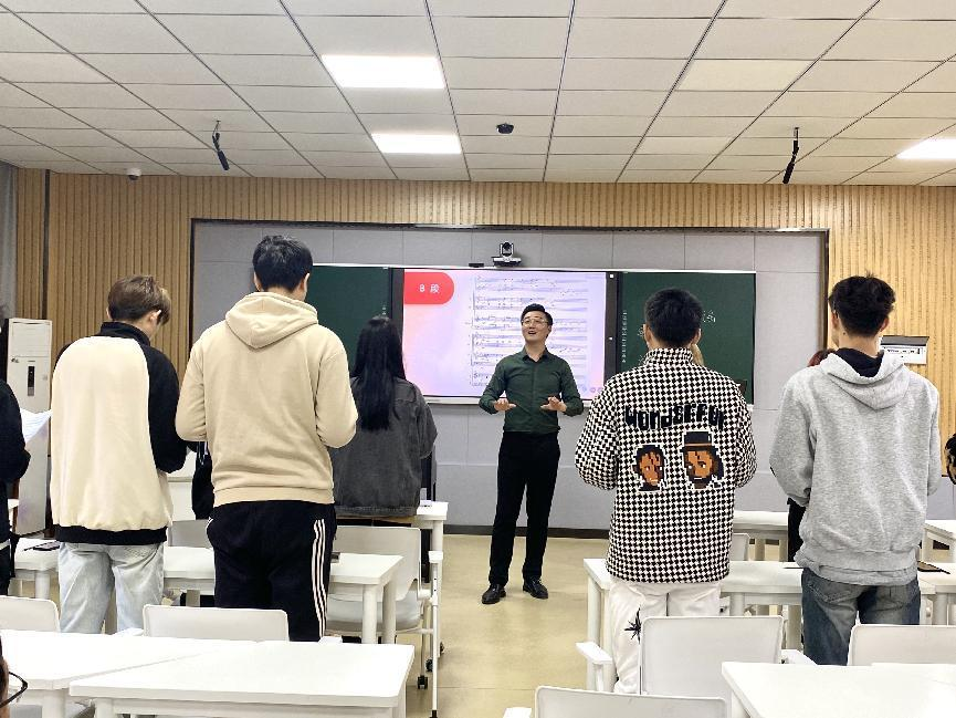 2022年11月4日下午,我院在艺术楼C楼203音体美智慧教室举行了主题党日系列活动——党员教学示范课活动。此次活动邀请了教工党员、校第四届智慧教学大赛一等奖获得者张昱靖老师进行《合唱与指挥》课程的智慧教学示范。出席本次活动的有院党委书记张铭、副院长徐冉、党委副书记肖之进以及全体教师,活动由副院长彭传山主持。