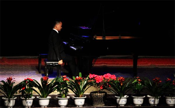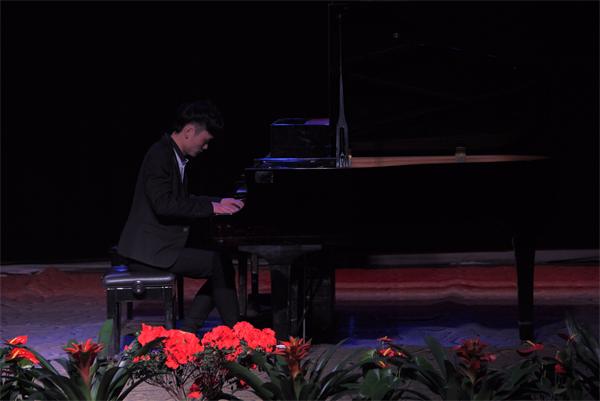 音乐会由《黄河船夫曲》序曲开始,由10级学生陈永霞演奏杨飞虎老师协奏,师生默契的配合把黄河钢琴协奏曲的前两个乐章呈现出来;11级戴心同学演奏了莫扎特奏鸣曲K.333和肖邦op.25.1“竖琴”练习曲,莫扎特中流露出“含着眼泪的微笑”,而肖邦中流露着一丝莫扎特般天使之歌;陈永霞演奏的2首肖邦《夜曲》一直给人宁静和优雅,使现场的观众们陶醉在优美的旋律和动听的和声之中。接下来在主持人杨顺的即兴演唱助兴后,由钟王君同学演奏了钢琴曲《浏阳河》,运用了变奏的手法,通过逐次加花的方式加厚旋律的线条,丰富的表现力使得现场达到第一次高潮。中场休息后,荣丽娟同学以饱满而又低沉的低音和弦组拉开贝多芬的《悲怆奏鸣曲》开始,全场瞬间安静,细细的聆听,观众仿佛能从他的悲怆中听到贝多芬再诉说他那坎坷不平的人生。车尔尼的八度练习曲时而像一首长号协奏曲,时而像一首轻快的波尔卡,进一步展现了演奏者技术。紧接着便是梁媛辰同学演奏的贝多芬的巨作《黎明奏鸣曲》,活泼的跳音,清晰的倚音,都在诉说这黎明前的欢乐,为我们探寻清晨森林里活泼欢乐的大聚会,鸟儿在歌唱,松鼠在跳舞,黎明的欢歌正在森林里唱响,台下的观众闭目在细细品味,如痴如醉。随后由陈永霞再次登台演奏了颇具难度的拉赫马尼诺夫前奏曲和肖邦谐谑曲,充分展现了浪漫派的激情与创新,拓展了琴的全新演奏技术,并将传统和声发展到极致。最后,杨飞虎老师弹了一首充满了梦幻色的李斯特夜曲《爱之梦》,杨飞虎老师技巧娴熟,感情细腻与琴声很好的交融在一起,音乐深情婉转、给人安静,使听者如痴如醉,陶醉在琴声里,台下观众听得如痴如醉,在观众经久不息的掌声中,音乐会圆满的落下了帷幕。整场音乐会结构构思巧妙,用纯钢琴演绎了多首不同风格题材的中外经典作品,精选的片头一首意大利情歌和片尾土耳其进行曲也给听众留下了深刻的印象。