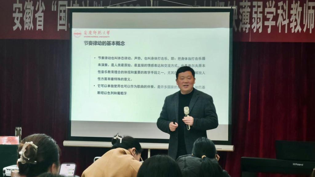 2023年2月10日,2022年安徽省“国培计划”农村紧缺薄弱学科教师短期集中培训项目——艺术(音乐)系列讲座第八场《节奏律动训练及在中小学中的运用》分别在小学音乐班和中学音乐班举行,由伟德国际victor1946副院长彭传山主讲。