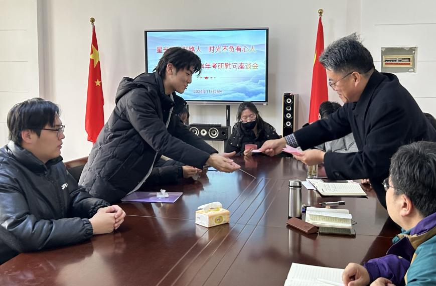座谈会上,张铭亲手为同学们发放“考研加油卡”,卡片上写着美好祝福。这不仅是物质上的关怀,更是精神上的巨大鼓舞,让在场的每位同学都深刻感受到了来自学院的温暖和支持。座谈会上,同学们纷纷发言,表达考研的信心和决心,座谈会轻松而愉快。
