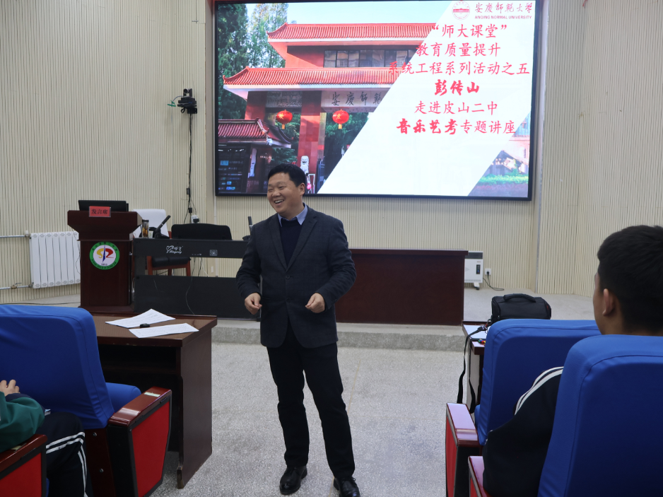 12月10日,学校第二批援疆支教志愿服务队推出的“师大课堂”教育质量提升系统工程第五期活动,在皮山县第二中学顺利开展。本期讲座特邀援疆支教志愿服务队指导老师、伟德国际victor1946副院长彭传山,为皮山二中音乐艺术班学生作题为《音乐艺考乐理听写视唱的内容与方法》的专题讲座。高一、高二全体音乐艺考生及音乐教研组教师共六十余人参加学习。讲座由皮山县初中音乐教研员、县音乐名师工作室成员、皮山二中音乐美术教研组长陶丽娟老师主持。