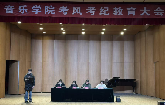 12月24日,学院在音乐厅召开2025—2026学年第一学期考风考纪教育大会,旨在强化师生纪律意识,营造公平公正的考试环境。院党委书记张铭、副书记贾涛、教务秘书熊星子、教师代表张源宁出席会议,学院大一至大三全体学生及辅导员参加会议。