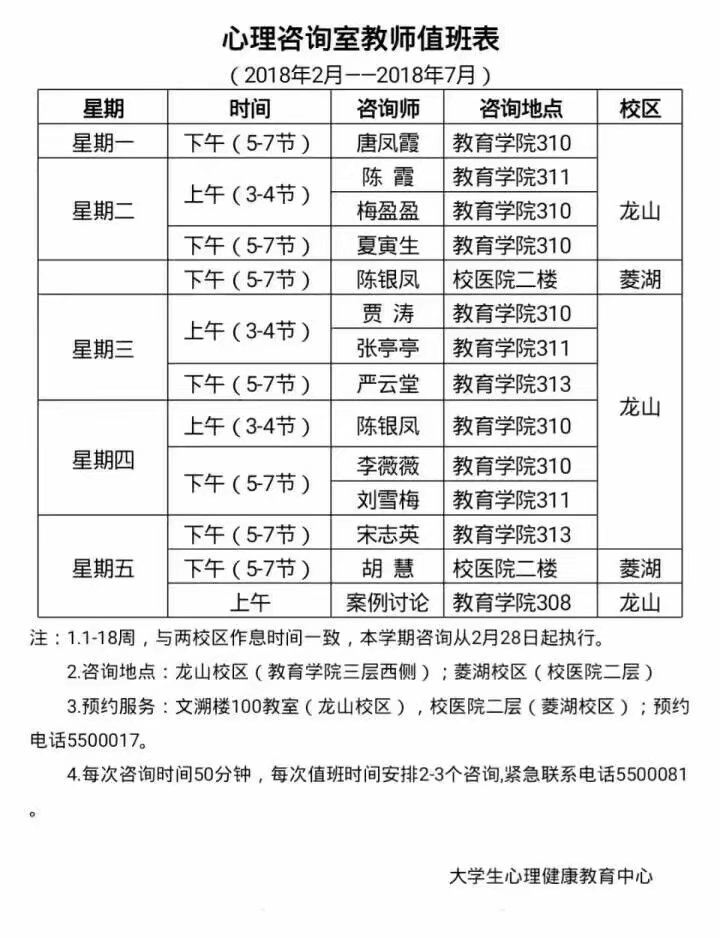 2017-2018学年第二学期心理咨询室教师值班表