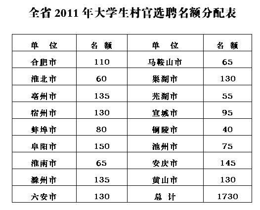 全省共选聘大学生村官1730名。以市为单位分配选聘指标(附后)。各市所辖县(市、区)选聘指标由市根据实际进行分配(详见笔试后的各市通知)。