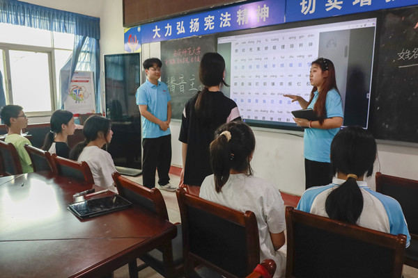 “普通话表达不畅、发音不准”,腊树中学办公室主任产九胜坦言的语言能力短板,成为团队今年发力的重点。依托专业优势,“音为爱”团队创新打造“艺术+语言”融合课堂:播音与主持课锤炼字正腔圆,气息掌控在模拟播报中悄然提升;诗词演唱课让古典名篇乘乐飞翔,咬字吐字于悠扬旋律间自然精进;文学作品短剧排练中少年化身剧中人,在角色共鸣中深化情感表达;辩论赛、绕口令擂台、配音大赛更以竞技乐趣点燃表达热情。十二天密集课程辅以多样实践活动,艺术成为提升语言文化的金钥匙,助力乡村少年自信发声。