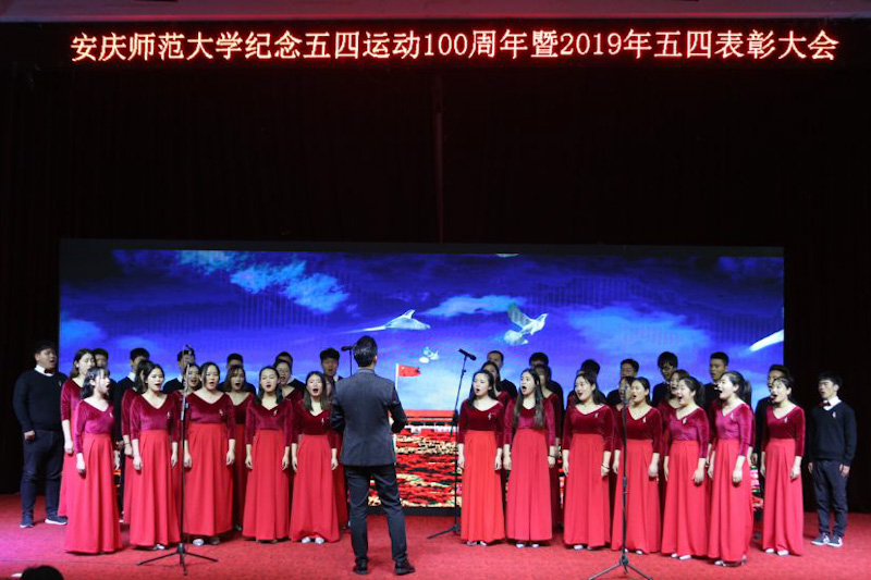 表彰大会现场,音乐(黄梅剧艺术)学院公共艺术(艺术实践)教研室牵头精心组织了精彩的文艺节目。“不忘初心,继续前进;万水千山,最美中国道路。”学院合唱团师生40余人紧扣大会主题,共同演绎时代主旋律《不忘初心》。乘着歌声,我们铺开七彩的画卷;走向未来,我们书写豪迈的誓言;初心不忘青春志,匠心共筑中国梦!小合唱《五月的鲜花》、《共筑中国梦》给大会增添了浓厚的青春气息和热烈气氛,不断将大会气氛推向高潮,精彩演出赢得台下阵阵掌声。