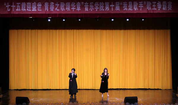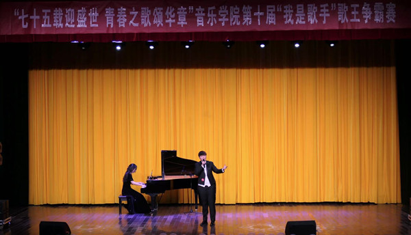12月15日,我院“七十五载迎盛世 青春之歌颂华章”第十届“我是歌手”歌王争霸赛决赛在校音乐厅举行。院党委副书记肖之进、副院长彭传山及300余名观众来到现场观摩。副院长高艳,教师刘蕊、王鹏、张源宁、王晨宇担任评委,18个兄弟院系学生会成员担任赛事观众评委。
