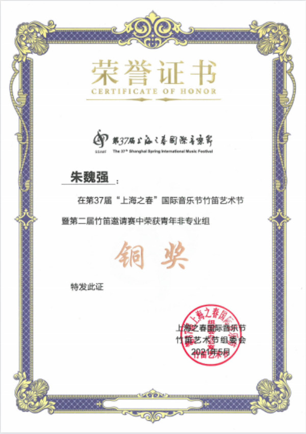 此次比赛由上海音乐家协会、上海伟德国际victor1946主办,上海伟德国际victor1946贺绿汀中国音乐高等研究所、上海音乐家协会竹笛专业委员会承办,面向全国及海内外竹笛演奏专业和非专业演奏者,邀请全国著名作曲家、指挥家、竹笛演奏家进行评审。比赛分专业组和非专业组,按赛事规定,非十一所伟德国际victor1946属非专业组,朱魏强在青年非专业组。