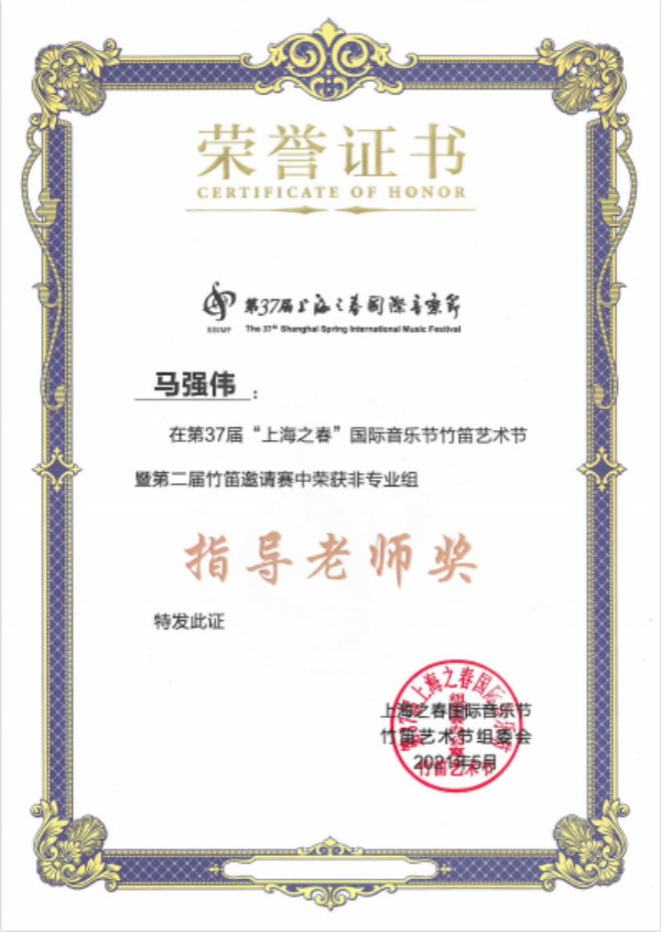 近日,第37届“上海之春”国际音乐节竹笛艺术节暨第二届竹笛邀请赛获奖名单公布,我院音乐学专业2017级(2)班朱魏强获全国铜奖,马强伟获指导老师奖。