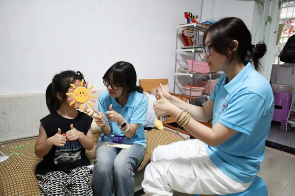 “圆圆和满满平时不太爱笑。”看着女儿与“小老师们”十分亲近,曹玲霞始终欣慰地看着两个女儿,当她们能在志愿者们的带领下完成《小星星》的哼唱与手势舞时,她专注地为女儿录制视频。“她们能与老师们互动与交流,我心里满是感动。”曹玲霞坦言,她非常感谢志愿者们能够上门送教,陪伴自己的三个孩子,这份快乐将一直留存在孩子们的记忆中。