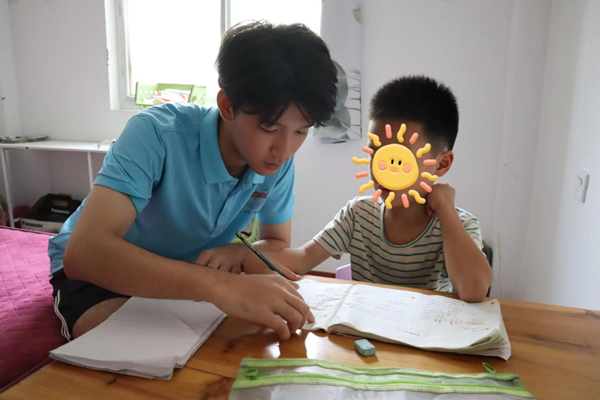 二年级的哥哥小恩患有轻度学习障碍,注意力易被分散。实践队员徐慧东化身“小老师”,负责辅导小恩的数学作业,“遇到两位数加法的时候要记得摆竖式验算,摆竖式的过程中注意逢十进一……”房间里,徐慧东手把手引导他静下心阅读每一道题,教他提高运算准确度。几经练习后,小恩逐渐掌握了运算技巧。仔细读题,小恩已经能够独立完成难度较大的题了。“徐老师教会了我很多,平时不懂的知识点很多都明白了。”他说。