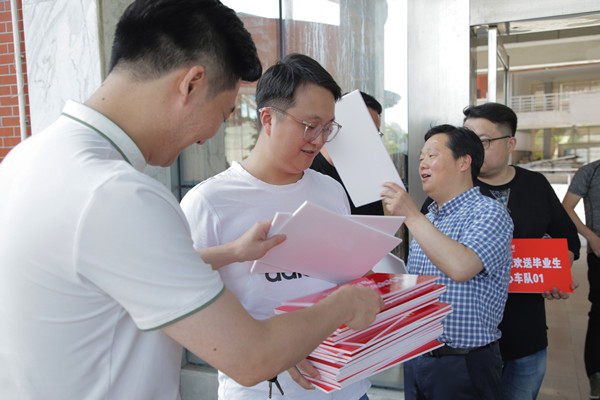院党委副书记、毕业班辅导员肖之进询问学生离校前往高铁站、汽车站等需求情况,并将接送任务发布在“爱心车队”微信群里,爱心车队老师在群里“接单”,实现“定制”服务。任务常常一经发布就被“秒光”,不少教师还主动“找活干”,即将退休的陈燕翔老师没有在群里抢到“任务”,“请求”年轻老师“让单”,实现了再送学生一程的愿望。一场场“双向奔赴”的“返航”在校园启程。