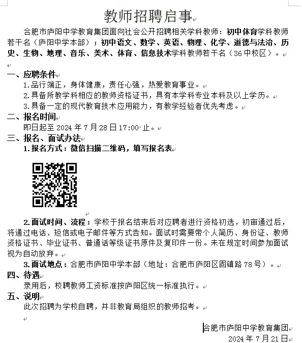 合肥庐阳中学教育集团教师招聘